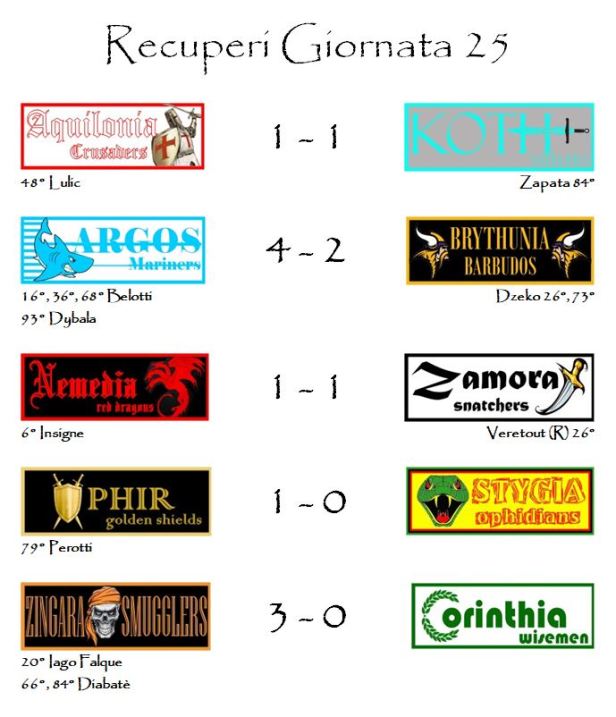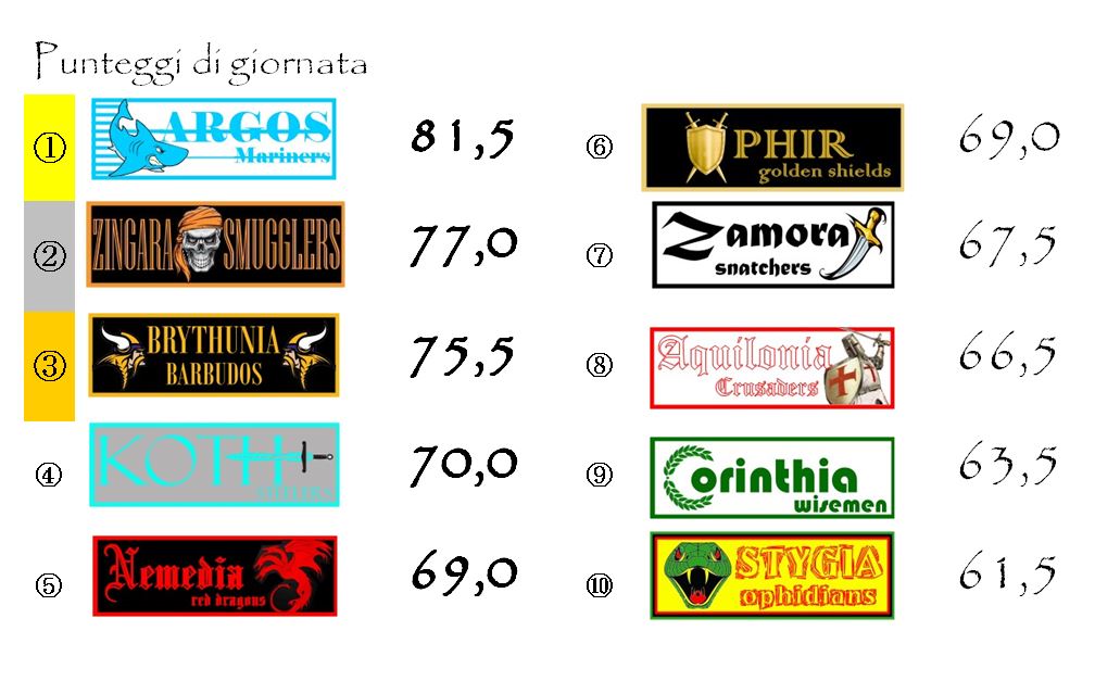 La quinta piazza della graduatoria è occupata ora da Aquilonia che ha perso una posizione proprio a vantaggio di Argos. I Crusaders non sono andati oltre l’1-1 in casa contro il fanalino di coda Koth (ben sette i punti conquistati dagli Steelers nelle ultime tre partite). A salvare la franchigia più prestigiosa della Lega è stato capitan Buffon che ha guadagnato i due punti bonus che hanno consentito ai suoi di sfondare quota 65 ed impattare il gol di Duvan Zapata grazie al quale Koth si era portata in vantaggio.