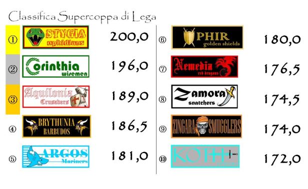 Capolista Stygia che, nonostante la giornata infelice, è riuscita ad allungare di un altro punto in Supercoppa. I Corinthia Wisemen non hanno messo a referto alcun bonus questa settimana, beffati dalla rete incassata allo scadere da Sirigu in Torino-Crotone e con una difesa a cinque che è stata in grado di mettere a referto solo 27 punti (pesanti le insufficienze di Hysaj e Castagne, pesantissima quella di Ajeti). Nelle retrovie hanno guadagnato una posizione, rispettivamente, Argos, che ha scavalcato Ophir e Zamora che ha scavalcato Zingara.
