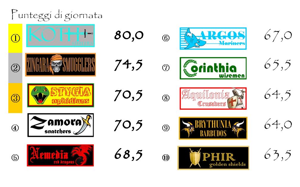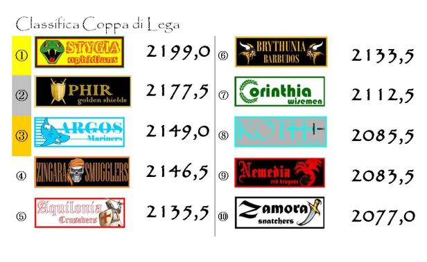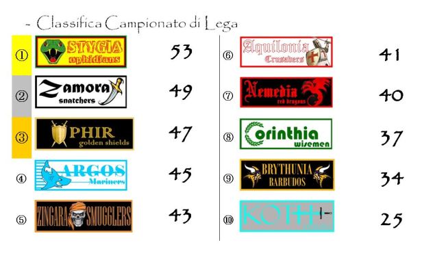 Koth Steelers grandi protagonisti anche della giornata di Coppa. I grigio-azzurri hanno recuperato due posizioni svestendo la maglia nera di ultimi in classifica ora indossata da Zamora. Il resto delle posizioni sono rimaste congelate, ma va segnalato l’importante allungo in vetta di Stygia su Ophir. Gli Ophidians si sono ripresi esattamente i sette punti che avevano perso domenica scorsa annullando la parziale rimonta degli avversari. Si è fatta ancor più serrata la lotta per il terzo posto con gli Zingara Smugglers che si sono avvicinati considerevolmente agli Argos Mariners (le due franchigie rivali, tra domani e mercoledì, si affronteranno nel derby). Aquilonia e Brythunia hanno invece perso un po’ di terreno.