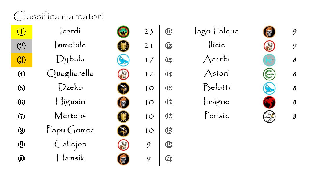 Congelata la classifica dei marcatori a causa delle poche reti segnate in serie A. A digiuno praticamente tutti i bomber. Occhio a Diabatè che, salito a quota 7, è appena al di fuori della top 17 qui in basso.