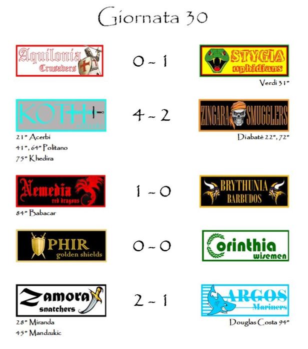 Un mattone fondamentale per la costruzione della vittoria del Campionato lo ha messo la Stygia che è riuscita a passare, seppur di misura, sul campo degli Aquilonia Crusaders. Gli Ophidians, a dispetto del risultato stretto, sono andati sul velluto, grazie ai bonus gol di Pavoletti e Verdi. Icardi e compagni non sono riusciti a centrare la soglia del secondo gol solo a causa del 4 in pagella con il quale la Gazzetta dello sport ha stroncato la prestazione di Vasco Regini, subentrato al posto di un Alex Sandro cui è toccato il tunrover.