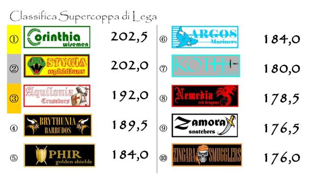 E’ arrivata invece una svolta clamorosa in Supercoppa con lo storico sorpasso di Corinthia ai danni della Stygia. I bianco-verdi hanno messo insieme ben tre punti bonus questa settimana. Gli Ophidians, che guidavano incontrastati questa graduatoria speciale sin dalla sesta giornata, solo uno. Si è concretizzata dunque una rincorsa lunga tutta la stagione e che, solo a fine febbraio, alla ventiquattresima giornata, aveva visto i Wisemen affiancare temporaneamente la franchigia di Khemi. Ci sono stati grandi sommovimenti anche in coda: i Koth Steelers che hanno fatto registrare un balzo in avanti di ben 6 punti (3 di bonus e 3 di miglioramento del proprio punteggio Top) hanno scavalcato in un sol colpo ben tre franchigie. Ora l’ultima posizione della classifica è occupata mestamente dagli Zingara Smugglers, la squadra meno avvezza all’accumulazione di punti bonus. Gli arancio-neri, da inizio campionato a questa parte, hanno collezionato infatti solo 29 punti extra. Mediamente meno di uno a giornata.