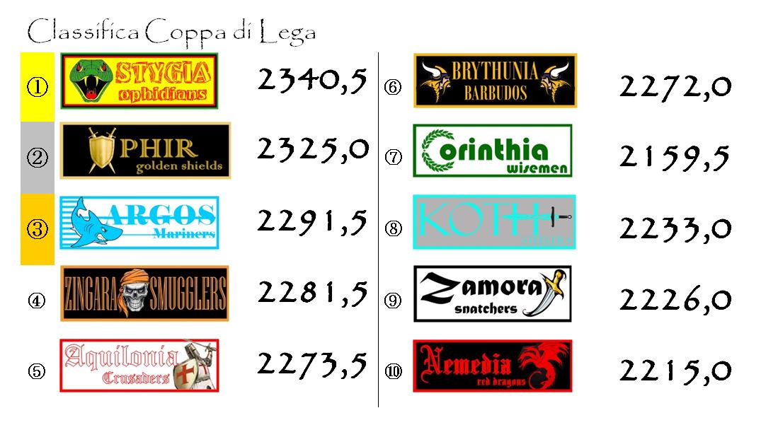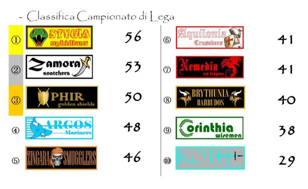 La trentaduesima giornata ha avuto risvolti molto importanti anche sulla classifica di Coppa di Lega. Ophir è riuscita praticamente a dimezzare lo svantaggio che aveva nei confronti della capolista Stygia e ora insegue a soli 15 punti e mezzo di distanza. La sfida per l’Elmo d’oro può dunque considerarsi completamente riaperta. Saranno quattro giornate molto bollenti in quest’ottica sia per quanto riguarda il primo posto che per quanto riguarda il terzo. Alle spalle di Ophidians e Golden Shields si è consumato infatti l’ennesimo contro-sorpasso tra Argos e Zingara. Ora i Mariners hanno dieci punti di vantaggio sugli avversari con Aquilonia e Brythunia che rimangono alla finestra, un po’ attardate ma comunque ancora a distanza di tiro. Quasi definitivamente fuori dalla disputa Corinthia che dista poco più di trenta punti.