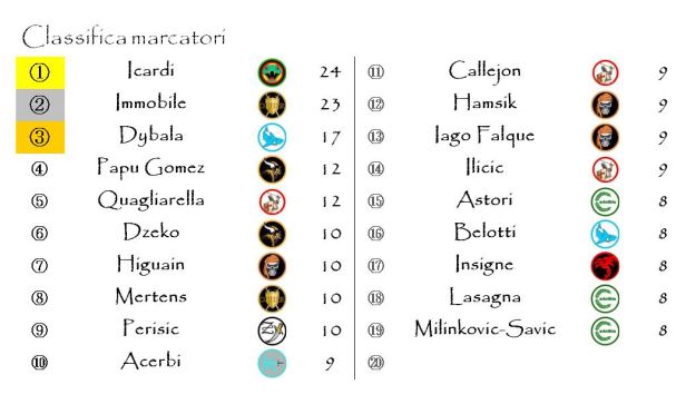 Con la doppietta arrivata nel finale contro la Sampdoria Ciro Immobile ha riaperto alla grande la corsa al Pugnale d’oro di Hyboria. Il bomber di Ophir ora è ad una sola lunghezza dal rivale di tutta la stagione Mauro Icardi che si è visto negare la marcatura nonostante il bonus gol ottenuto contro il Chievo. Hanno risalito la graduatoria dei Marcatori anche il Papu Gomez (che da capitano della Brythunia ha beneficiario di una marcatura extra), Perisic, Lasagna e Milinkovic Savic.