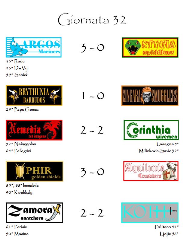 A cercare di rientrare come terzo incomodo nella lotta per il titolo ecco gli Ophir Golden Shields risorti in una domenica che sulla carta non si annunciava semplicissima. La franchigia dello scudo ha spazzato via e definitivamente estromesso dalla lotta per il terzo posto gli Aquilonia Crusaders. Il rotondo 3-0 è maturato grazie ai bonus gol di Immobile, Koulibaly e Romulo. Il passivo non è stato più pesante perché Strootman e compagni hanno mancato la soglia della quarta marcatura per solo mezzo punto. A quattro giornate dalla fine il distacco di Ophir dalla capolista Stygia è di 6 punti e appare comunque molto complicato da colmare. Non bisogna tuttavia dimenticare che tra due giornate andrà in scena a Khemi lo scontro diretto e che, la domenica successiva, a Ianthe, arriverà anche Zamora. La franchigia dello scudo ha ancora margini per provarci, fermo restando il dovere di difendere un terzo posto ancora molto precario. Le due franchigie che seguono immediatamente dietro, ovvero Argos e l’avversario della settimana prossima Zingara, restano avversari molto pericolosi in quest’ottica.
