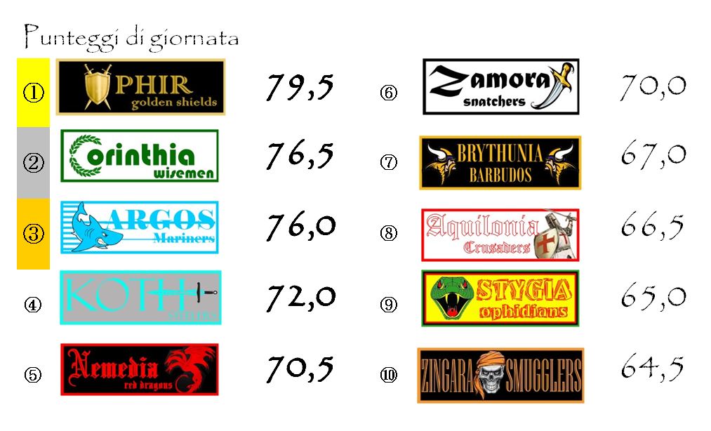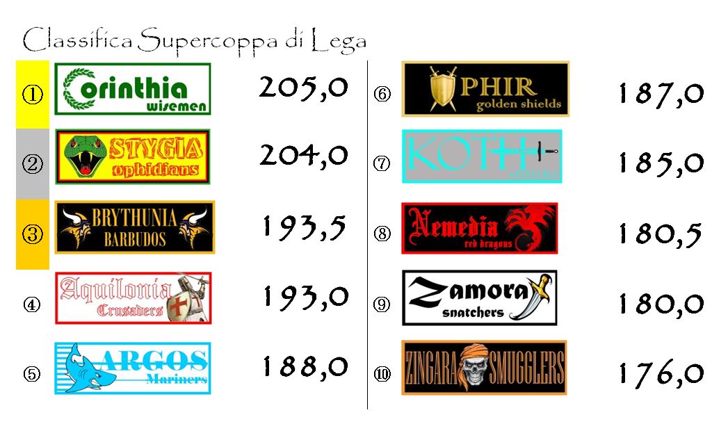 Alle spalle delle due protagoniste incontrastate della terza competizione per importanza dell’Hyboria League adesso c’è Brythunia che ha superato Aquilonia. Giornata decisamente negativa per i Crusaders che non ha raccolto neanche un punto di bonus. Possiamo considerare ancora in corsa per la terza piazza anche Argos, Ophir e Koth. Queste tre franchigie distano però più di cinque lunghezze. Il ritardo non è impossibile da colmare ma quella della Supercoppa è una classifica che si muove molto lentamente e in quattro giornate bisognerebbe fare veramente incetta di bonus, sperando contemporaneamente in un passo falso di chi precede.