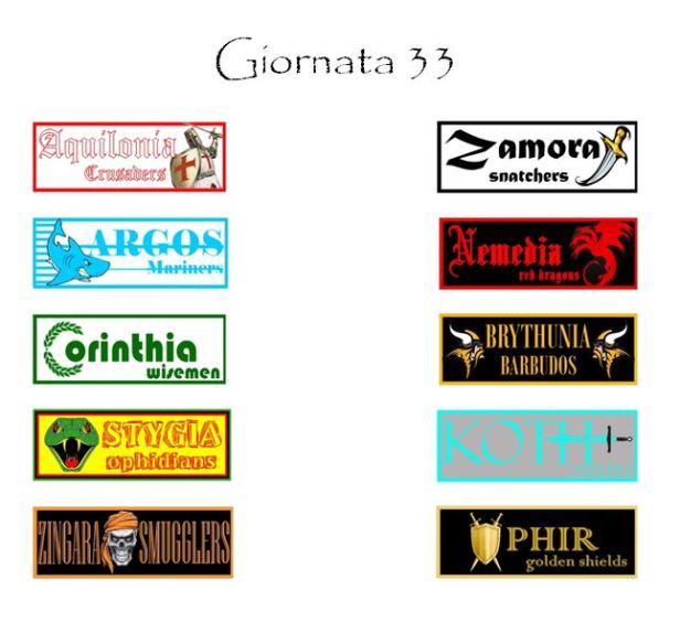 Avranno una gara difficile anche gli Zamora Snatchers che andranno a Tarantia a far visita ad una Aquilonia estromessa da ogni discorso in Campionato ma pur sempre ancora in corsa su tutti e due gli altri fronti. I pronostici sono a favore dei Crusaders semplicemente perché Buffon e compagni avranno dalla loro il fattore campo. La terza forza del Campionato, Ophir, sarà protagonista dello scontro più importante di tutta la trentatreesima giornata: i Golden Shields saranno infatti ospiti della quinta in classifica, gli Zingara Smugglers. I padroni di casa saranno sicuramente privi di Diabatè ma riavranno a disposizione sia Luis Alberto che Iago Falque cosa che ci spingerà, molto probabilmente, ad optare per un modulo con ben tre trequartisti.