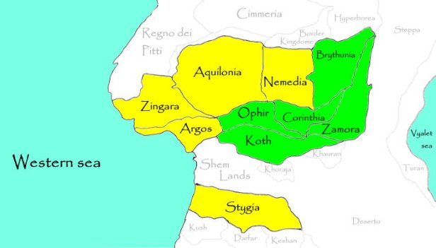 Il blocco dell’Ovest è rappresentato dalle tre nazioni che si affacciano sul Western Sea, ovvero Zingara, Argos e Stygia, e dai due regni più prestigiosi, posti al centro del continente, ovvero Aquilonia e Nemedia. Sono tutti e cinque colorati in giallo nella cartina sottostante.