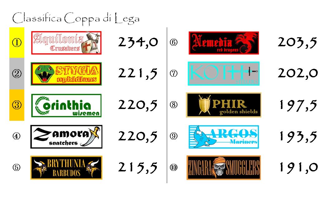 La classifica della Coppa di Lega vede sempre al comando Aquilonia. Alle spalle dei Crusaders un terzetto agguerrito di inseguitrici con Stygia, Zamora e la new-entry Corinthia che ha guadagnato ben tre posizioni. A ruota di questo gruppetto c’è la solita, sorniona, Brythunia, che anche l’anno scorso passò tutta la stagione agganciata al trenino delle migliori agguantando il sorpasso che le valse il podio nelle ultime, decisive, giornate. Dietro tutte le altre con Ophir, Argos e Zingara ancora sotto quota 200.