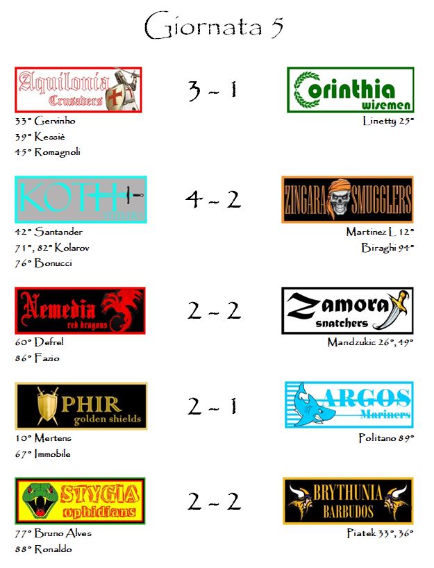 E’ stato il turno più prolifico di questa seconda stagione. La “V” nera è andata ai Koth Steelers, quinta franchigia diversa in cinque giornate. Segno di un campionato che, al di là dello strapotere stygiano, sembra molto equilibrato.