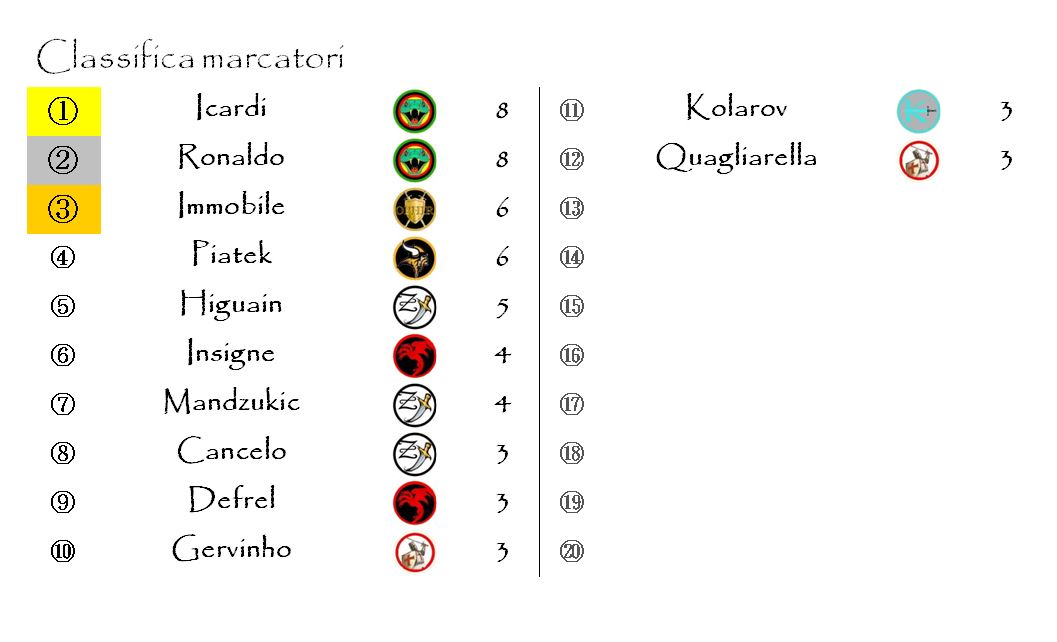 Ed è dominio stygiano pure nella classifica dei marcatori che vede ora al comando la coppia composta da Cristiano Ronaldo e Mauro Icardi. I due goleador degli Ophidians hanno distaccato Immobile e Piatek di ben due lunghezze e sembrano voler rendere questa corsa al Pugnale d’Oro 2018-2019 una questione personale.