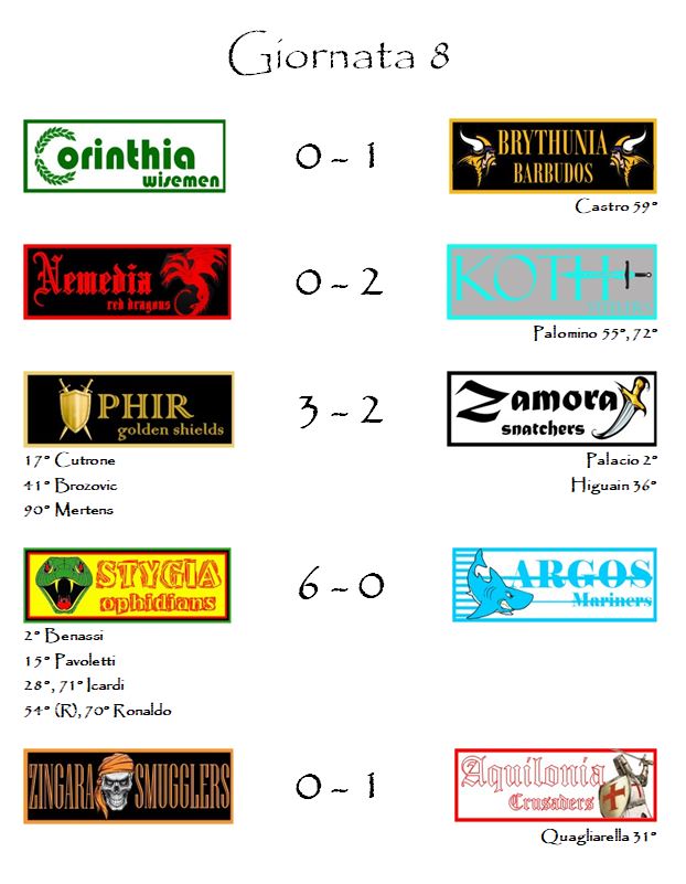A subire in maniera diretta la verve realizzava degli stygiani sono stati gli Argos Mariners. Impietoso il 6-0 finale con il quale la capolista ha sconfitto il fanalino di coda grazie a ben sei bonus gol: due di Icardi, due di Cristiano Ronaldo, uno di Benassi e uno di Pavoletti. Bravissimi tutti quelli che avevano votato per il centravanti del Cagliari che avevano contrapposto a Paloschi agli Hyballottaggi di venerdì.