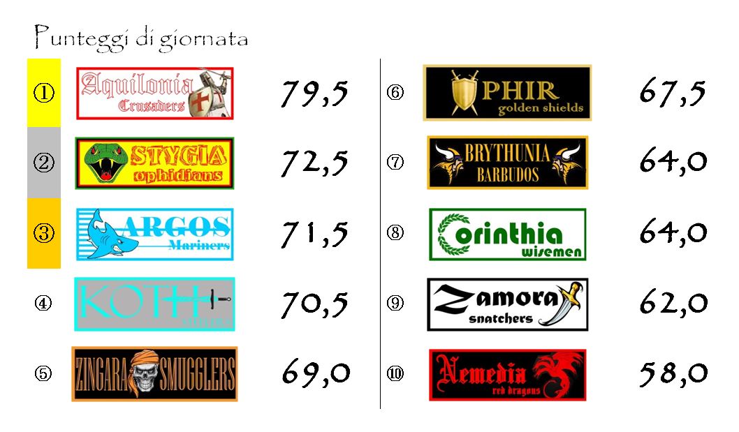 In Coppa di Lega è tornata torna al secondo posto Aquilonia che ha sorpassato Ophir e ha riguadagnato qualche lunghezza sugli stygiani, comunque ancora molto lontani.