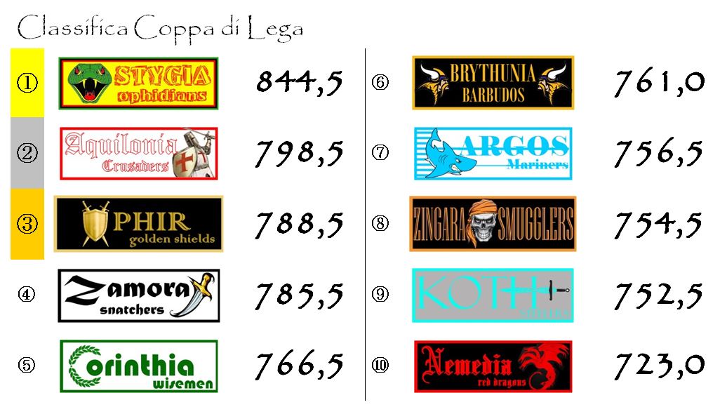 Giornata positiva anche in Coppa di Lega per la Stygia che ha guadagnato terreno su tutte le più immediate inseguitrici. Ora gli Ophidians hanno oltre quaranta punti di vantaggio sui Crusaders e più di cinquanta su Golden Shields e Snatchers.