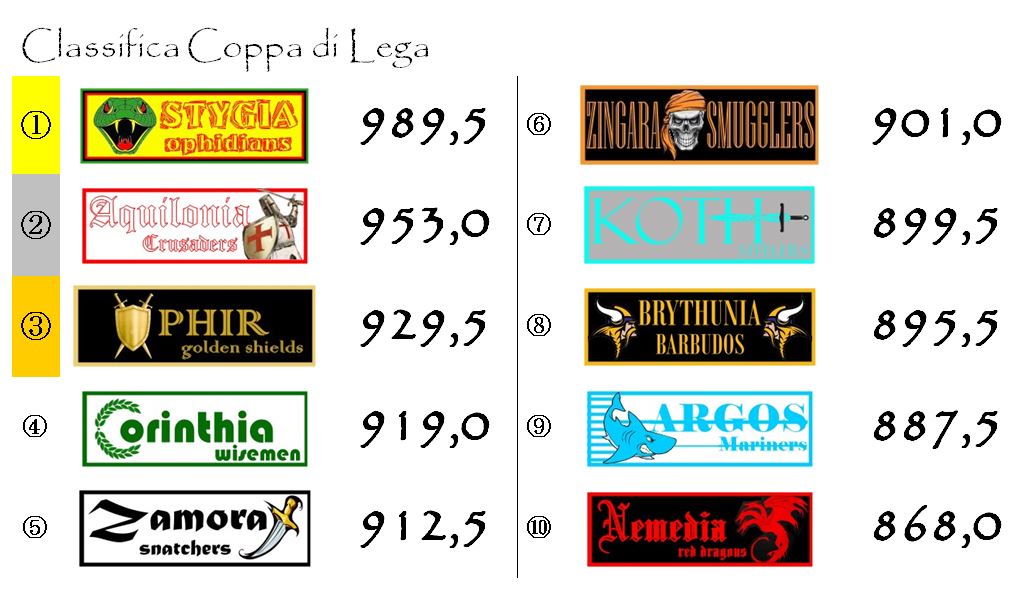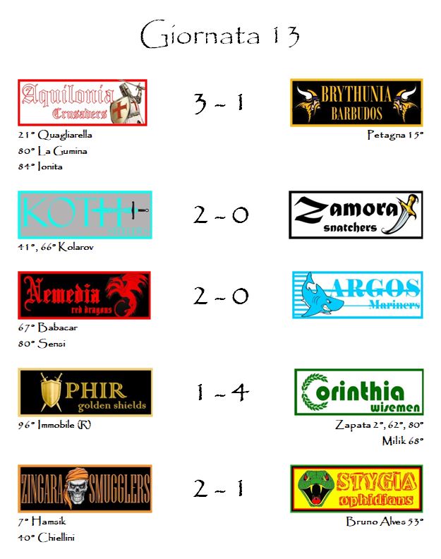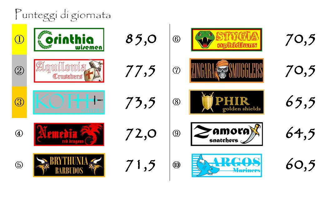 Dopo tredici giornate è caduta, e non senza sorprese, la capolista Stygia, sconfitta sul campo di Zingara per 2-1. Una vittoria, quella degli Smugglers, maturata grazie ad una serie incredibile di coincidenze. Ad avvantaggiare gli arancio-neri, innanzitutto, il fattore campo. Le due franchigie sono arrivate appaiate a quota 70,5, punteggio che è bastato agli zingariani per sfondare la soglia della seconda rete. Soglia mancata invece dagli Ophidians che, giocando in trasferta, per marcare due reti di punti ne avrebbero dovuti realizzare almeno 72,0 punti. Fin qui tutto più o meno normale in un’Hyboria League che segue un regolamento concepito per rendere gli stadi delle franchigie dei fortini difficilmente espugnabili (potete trovare una spiegazione dettagliata nel post di 18 mesi fa “Vi spiego il regolamento: le trasferte“).