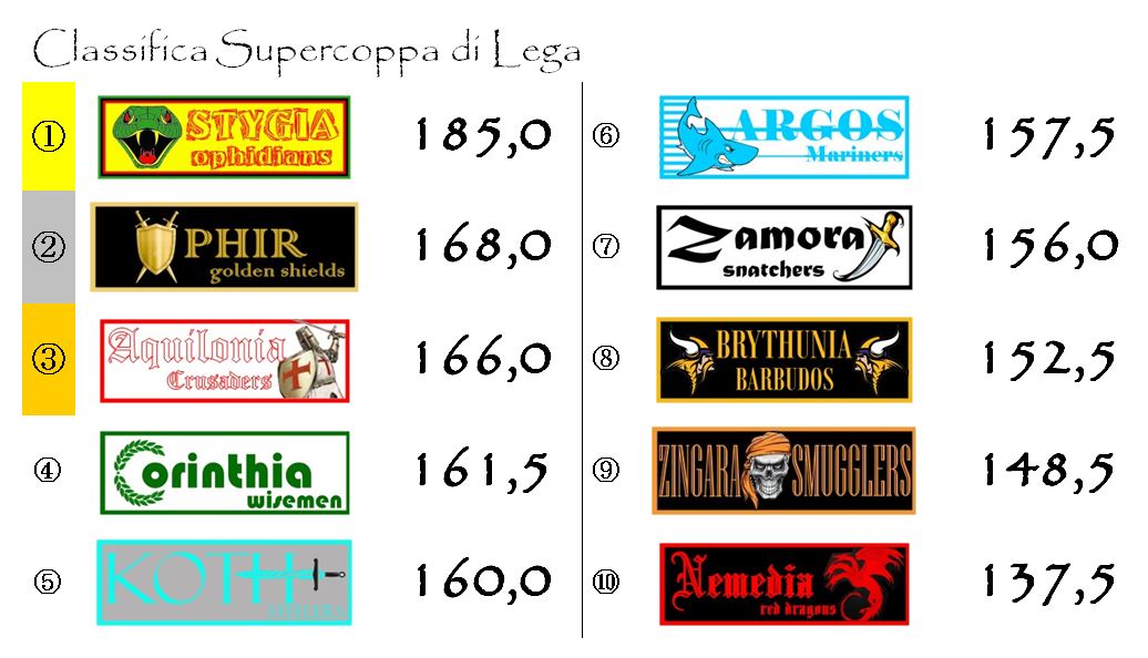 Poco è cambiato in Supercoppa. Nonostante il punteggio non entusiasmate Stygia è riuscita comunque ad incrementare di un punto il vantaggio su Ophir e Aquilonia grazie ai tre bonus di squadra guadagnati dai dieci uomini scesi in campo. Encomiabile la prestazione della difesa che di punti ne ha conquistati due grazie soprattutto ai 7 in pagella di Bruno Alves e Faouzi Ghoulam.