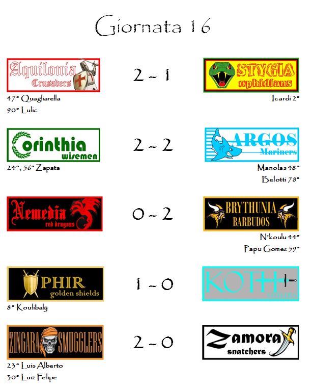 Ma il risultato che aspettavamo tutti trepidanti era quello che doveva arrivare dal Conan Memorial di Tarantia. Ebbene, gli Aquilonia Crusaders sono riusciti a portare a termine il clamoroso sorpasso imponendosi sui pluri-campioni di Stygia con un 2-1 risicatissimo nel punteggio fantacalcistico. Una sola lunghezza di differenza tra le due squadre è valsa ai padroni di casa il gol della vittoria. Trascinati anche oggi dalla premiata ditta Quagliarella – Lulic, i Crusaders sono riusciti a stendere Mauro Icardi e compagni, scalzandoli dalla testa della classifica dopo ben ventisei giornate (considerando anche le ultime dieci della scorsa stagione). Annichiliti gli Ophidians, senza bonus-gol all’attivo ma comunque forti di tre punti bonus extra e delle ottime prestazioni di diversi giocatori. Se avessimo schierato titolare Cristiano Ronaldo sarebbe finita diversamente, ma chi lo avrebbe fatto sapendo che il portoghese sarebbe partito dalla panchina e avendo a disposizione un recuperato Pavoletti (tra le altre cose premiato con un tondo 7 in pagella dalla Gazzetta dello sport per la sua prestazione contro il Genoa)?