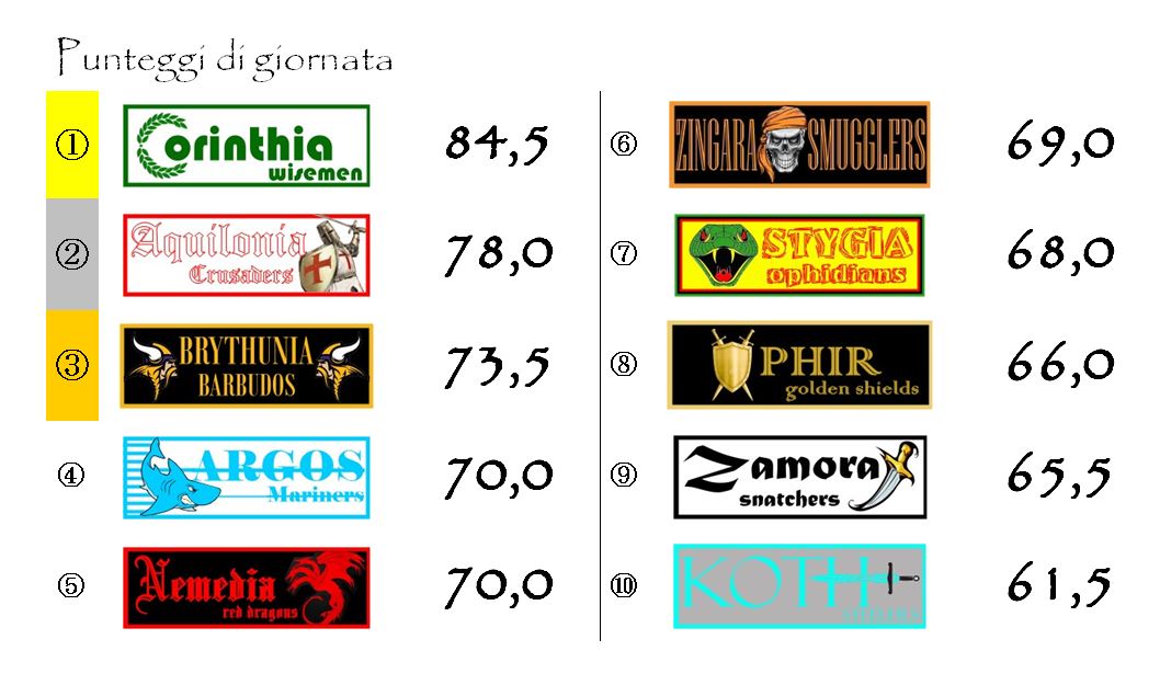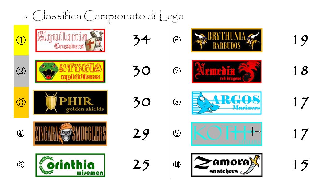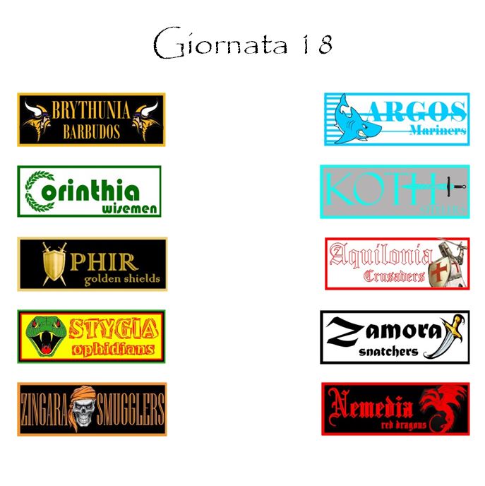 Classifica alla mano, impegni abbastanza semplici per le altre inseguitrici: la Stygia ospiterà Zamora, mentre Zingara riceverà la visita dei Nemedia Red Dragons.