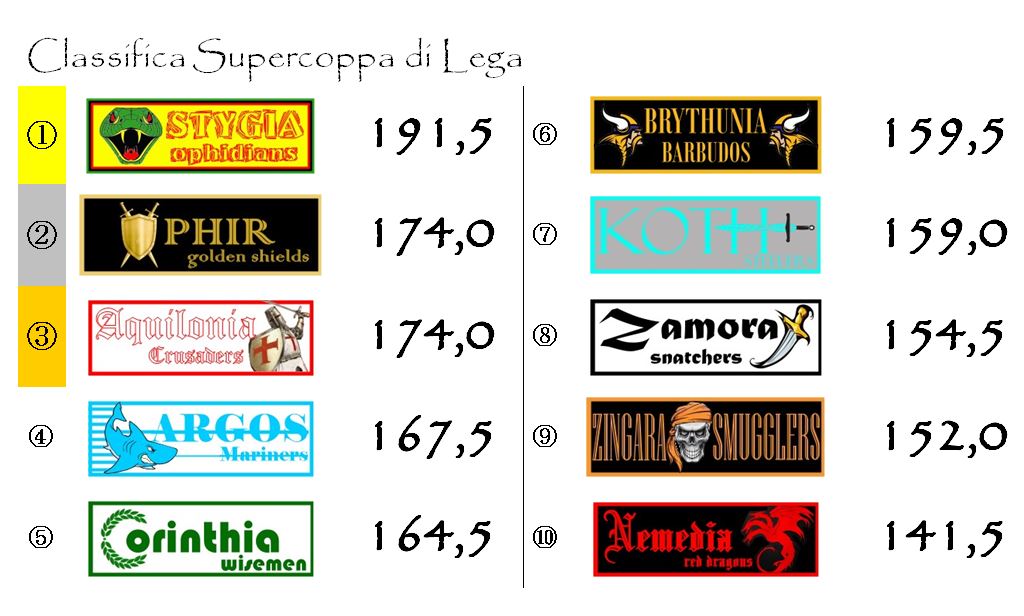 La giornata nera di Stygia ha avuto qualche ripercussione sulla graduatoria della Supercoppa. I campioni in carica hanno perso del terreno pur mantenendo un importante vantaggio sulle principali inseguitrici. Ophir è riuscita ad appaiare al secondo posto Aquilonia, e ora la distanza che separa le due franchigie dalla capolista è di 17,5 punti. Nessun movimento rilevante nelle retrovie. Da segnalare solo il sorpasso di Brythunia ai danni di Koth al sesto posto.