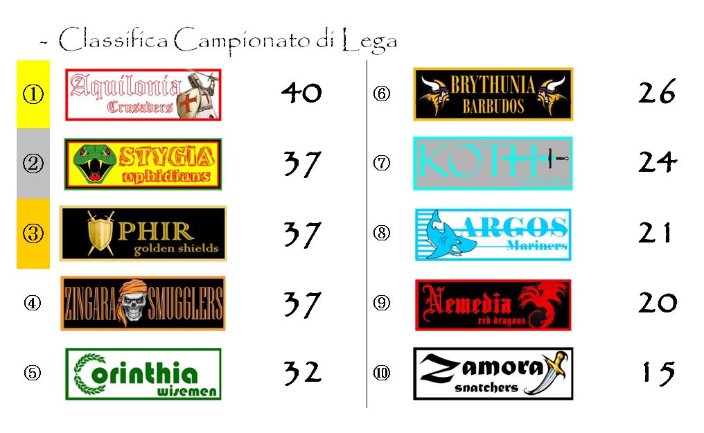 In Coppa di Lega diventa sempre più evidente come il terzetto di testa composto da Aquilonia, Stygia e Corinthia abbia un passo diverso. Le tre franchige sono le uniche ad aver sfondato quota 1500 punti e ad avere parziali paragonabili a quelli delle prime della scorsa stagione. Alla ventunesima giornata della scorsa Coppa di Lega l’allora capolista Ophir, poi giunta seconda, aveva 10 punti in più di quanti ne hanno ora i Crusaders. Lontanissime tutte le altre con Brythunia che è riuscita a guadagnare una posizione a discapito degli Zingara Smugglers.