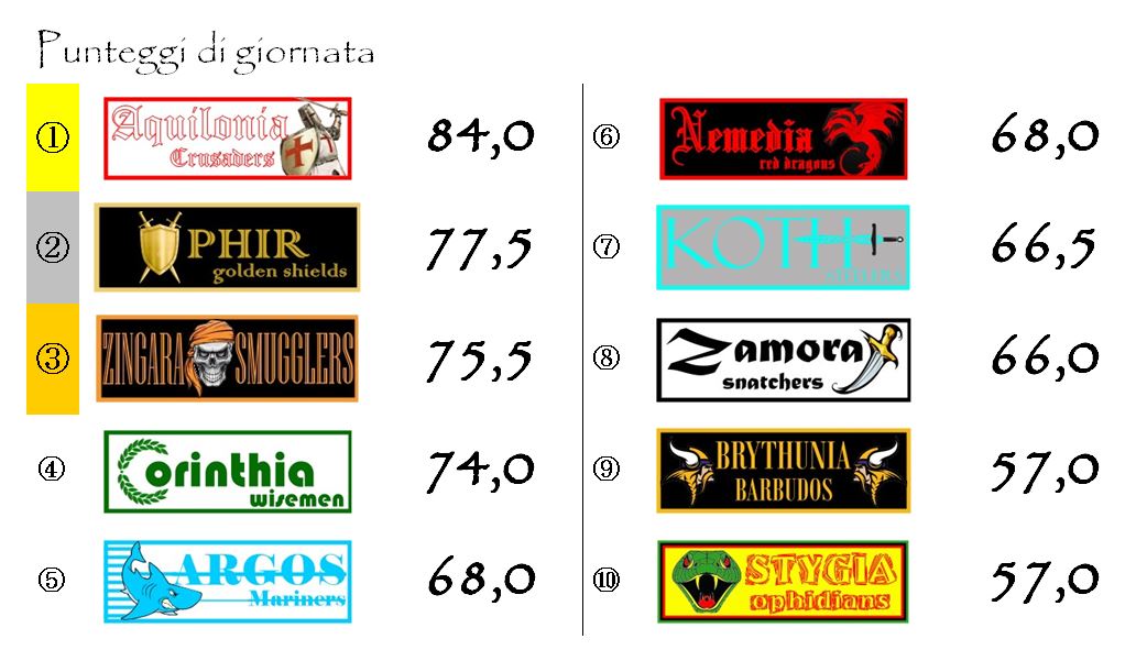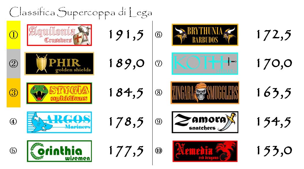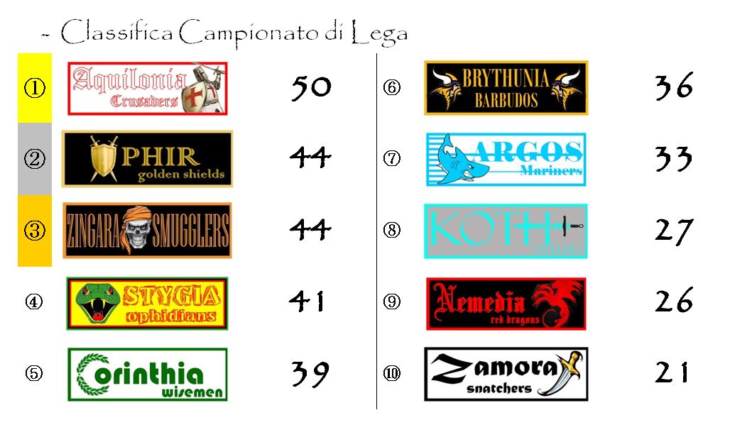 E’ stata una giornata fondamentale anche nella corsa alla Coppa di Lega. Aquilonia ha allungato su tutta la concorrenza consolidando il suo primato. Ora Corinthia ha oltre cinquanta punti di ritardo mentre la Stygia ne ha ben più di ottanta. Il terzo posto degli Ophidians è insidiato da Ophir che ha recuperato venti punti ai campioni in carica e che da qui alla fine potrà sicuramente provare a contendergli il gradino più basso del podio. Poco più lontane, in quinta e sesta posizione, Zingara e Brythunia, con quest’ultima che ha perso ben due posizioni in un colpo solo.