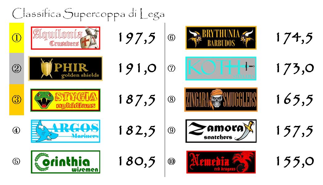 Ancor meno da segnalare per quanto riguarda la Supercoppa con otto delle dieci franchigie che hanno marcato un punto ciascuno e Zingara e Brythunia che invece sono rimaste a bocca asciutta.