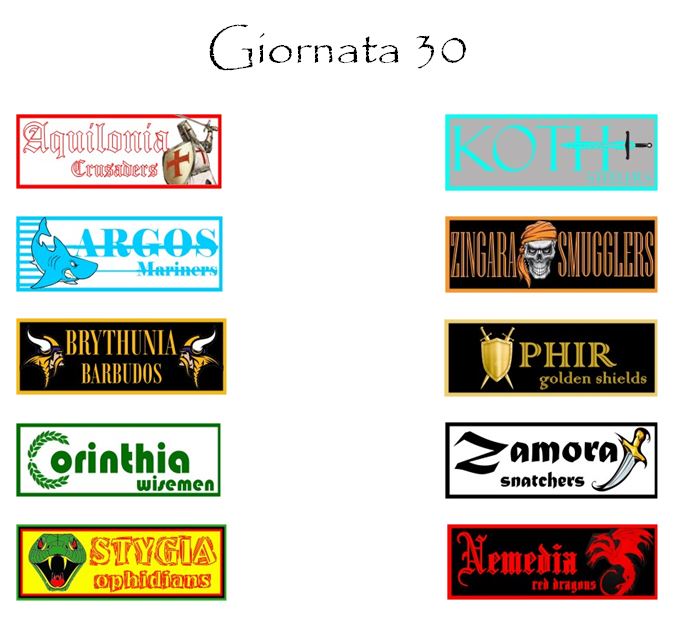 Il quadro sarà completato dall’incontro di Tarantia tra la capolista Aquilonia e i Koth Steelers. Una sfida densa di rivalità, soprattutto da parte degli ospiti, storicamente gemellati con i nemici storici di Aquilonia, i nemediani. I grigio-azzurri andranno ad affrontare i Crusaders privi del capitano Kolarov, squalificato.