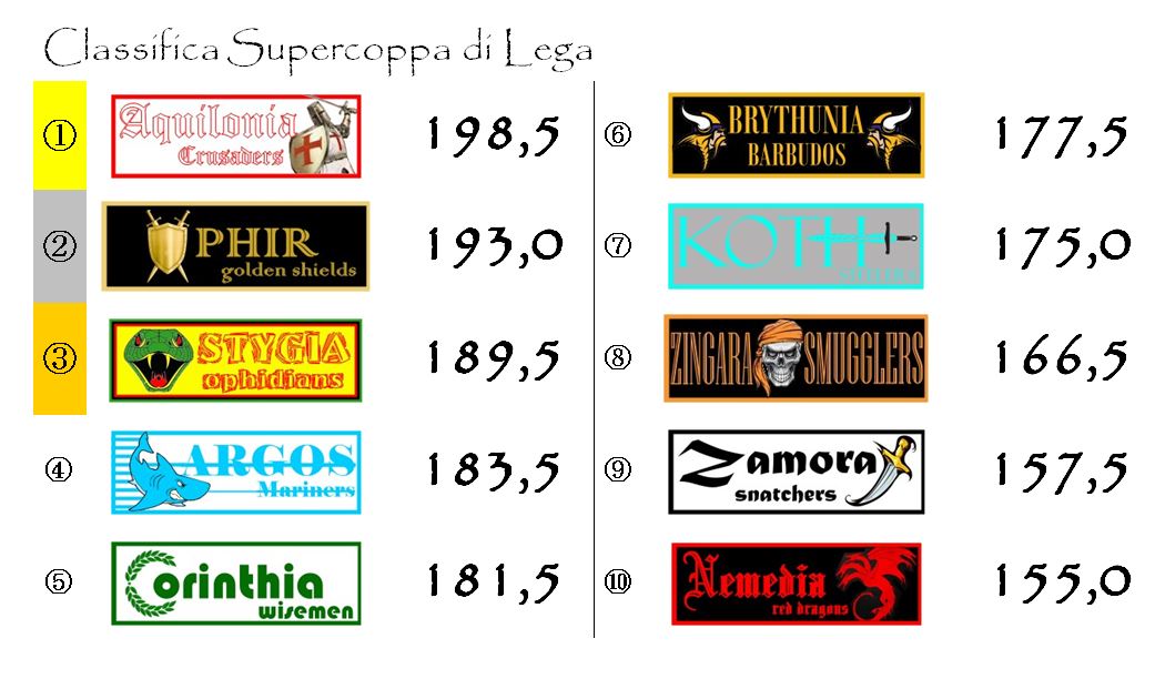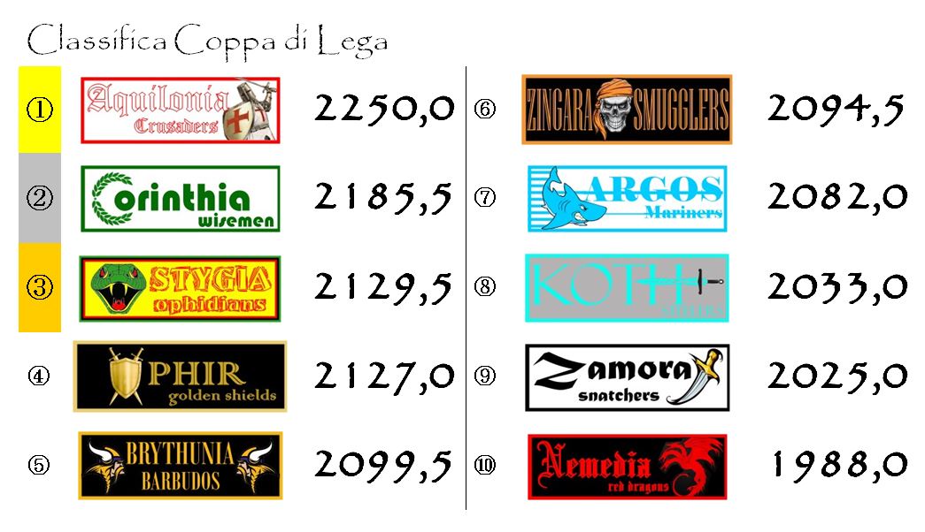 In Coppa di Lega la capolista Aquilonia si è prontamente ripresa i punti che Corinthia le aveva rosicchiato una settimana fa. Ora la distanza tra la capolista e la più immediata delle inseguitrici è di nuovo di oltre sessanta lunghezze. Lotta sempre aperta per il terzo posto con Stygia e Ophir divise da una manciata di punti e Brythunia che prova a rifarsi sotto, anche se distanziata di trenta lunghezze.
