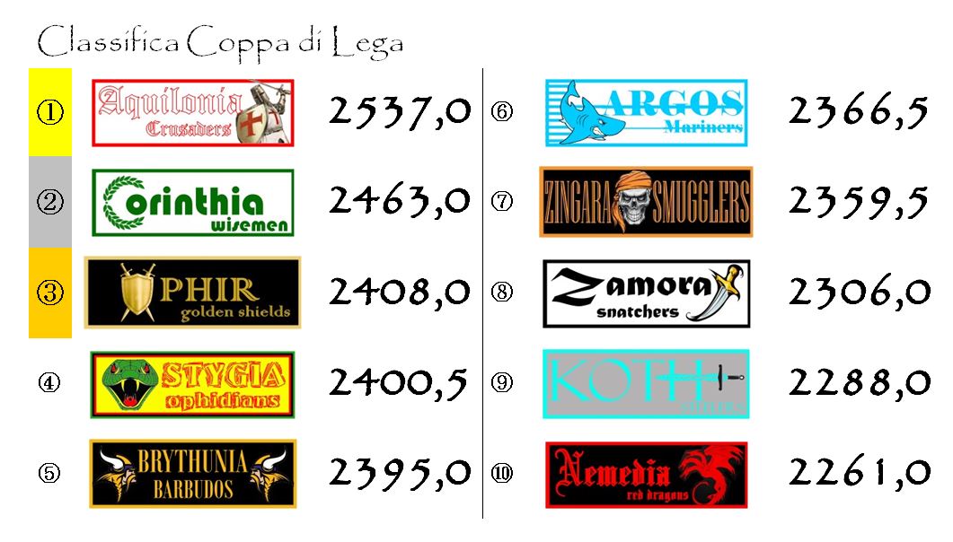 Domenica movimentata in Coppa di Lega. Aquilonia e Corinthia sono ormai certe della propria prima e seconda posizione, mentre la lotta per L’Elmo di Bronzo si è fatta ingarbugliatissima. I pessimi risultati di Ophir e di Stygia hanno permesso alla Brythunia di rimettersi in corsa. I Barbudos hanno ridotto notevolmente il gap e ora possono davvero crederci. A due giornate dal termine tredici punti sono rimontabilissimi. L’impresa non sembra più impossibile.