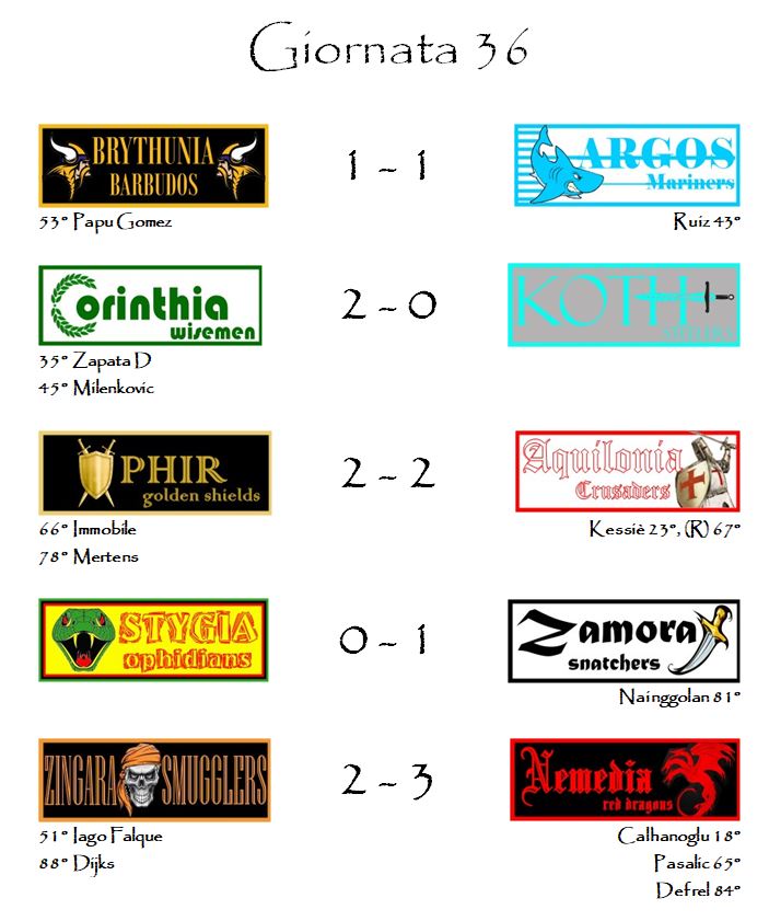 Chi deve mangiarsi letteralmente le mani è la Corinthia. I Wisemen hanno liquidato con un secco 2-0 i Koth Steelers (bonus decisivo di Duvan Zapata) concludendo il proprio campionato ad una sola lunghezza dalla coppia composta da Stygia e Zingara. Sono stati troppi i punti buttati dalla finestra in questo finale di Campionato. La franchigia più amata dai nostri amici di twitter avrebbe potuto fare molto di più dopo l’innesto di Piatek a febbraio. Peccato, sarà per l’anno prossimo.