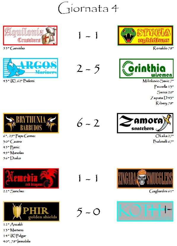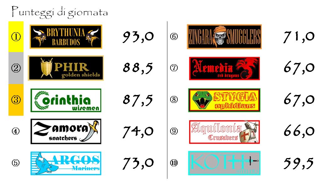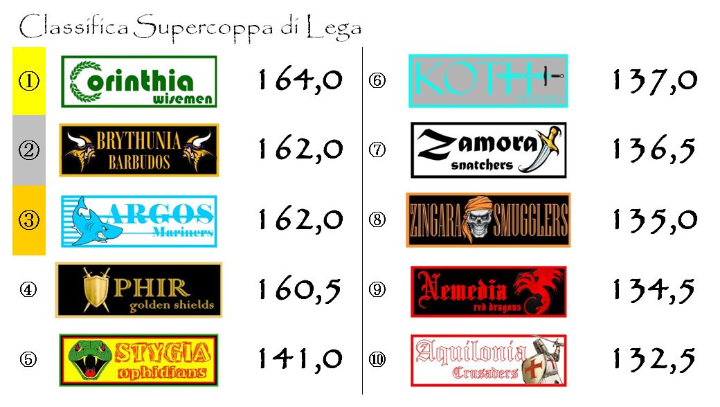 Stesso e identico discorso vale per la Supercoppa con Brythunia che è balzata in seconda posizione grazie al punteggio “schiatta-classifica” di questa quarta giornata. Anche qui abbiamo i Corinthia Wisemen al comando di un plotoncino composto da quattro franchigie mentre il resto del gruppo è molto distante.