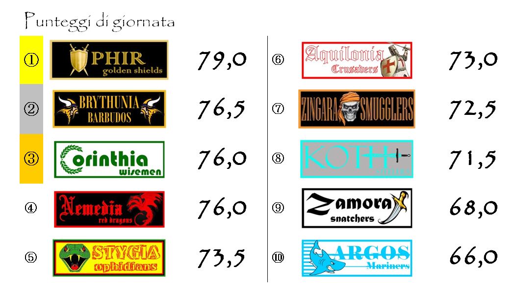 Il punteggio migliore è stato quello degli Ophir Golden Shields, alla prima “V” nera stagionale. Gli Scudati, trascinati dal capitano Ciro Immobile, hanno realizzato 79,0 punti andando a pareggiare per 3-3 il big match in casa dei Brythunia Barbudos, anch’essi autori di una notevole prestazione e del secondo miglior punteggio di giornata (76,5).