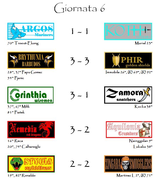 Le altre marcature extra sono andate ai capitani di Stygia e Brythunia, Ronaldo e Papu Gomez, ai difensori di Nemedia e Argos, Reca e Troost-Ekong, e ad Hakan Calhanoglu, autentico trascinatore dei Red Dragons nel vittorioso derby contro gli odiati aquiloniani.