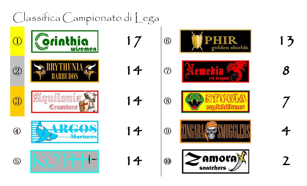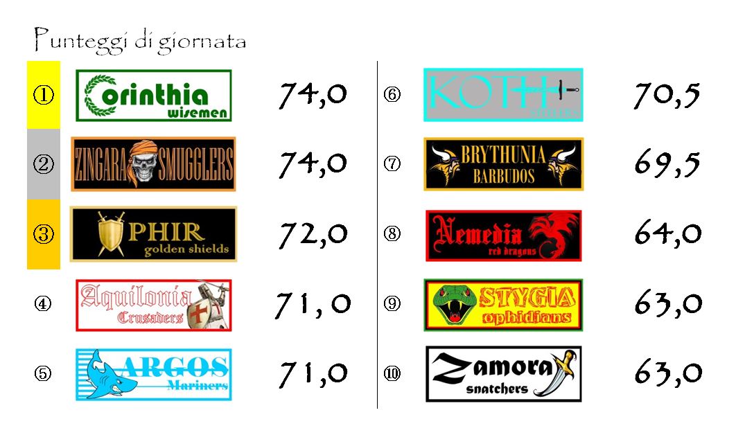 Situazione differente in Supercoppa dove continua ad essere in testa Brythunia. I Barbudos hanno conservato un paio di lunghezze di vantaggio su Corinthia e su Ophir nonostante la domenica non proprio brillante. Il gruppo degli inseguitori è guidato in questo caso dai Koth Steelers che hanno staccato la Stygia grazie ai tre bonus di squadra messi a referto in questa giornata. Se avessero portato a voto undici uomini i grigio-azzurri, con tutta probabilità, ora sarebbero sopra quota 150, più vicini al quarto posto che al sesto.