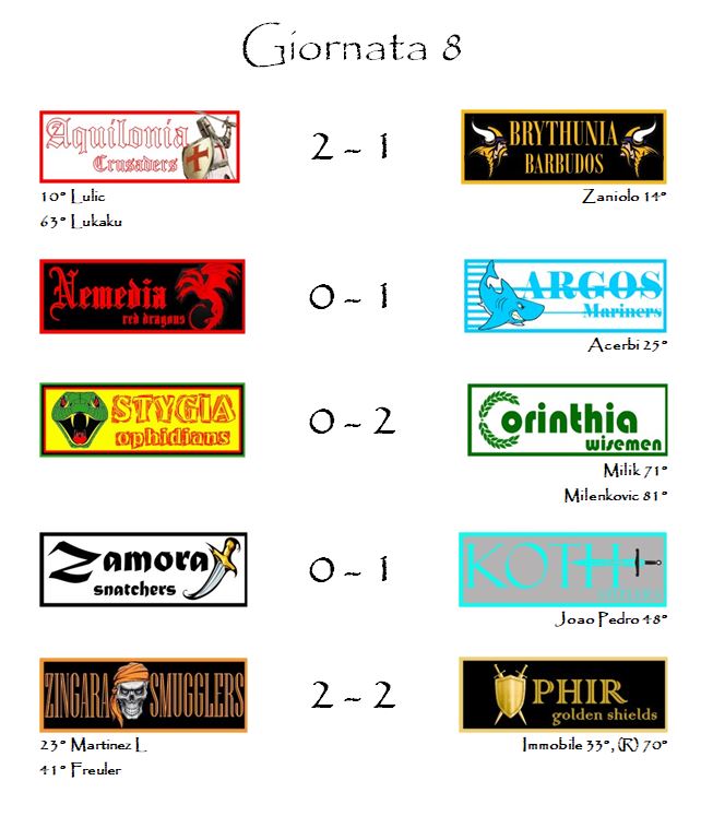 I Corinthia Wisemen si sono ripresi la testa solitaria della classifica andando ad espugnare con un secco 0-2 il campo degli Stygia Ophidians. Di Milik e Milenkovic le reti del successo bianco-verde. Gli stygiani, andati in rete con Cristiano Ronaldo, non sono riusciti neanche a marcare il goal della bandiera, traditi dall’autorete di Skriniar in Brescia-Inter e dall’espulsione di Rabiot in Juve-Genoa.