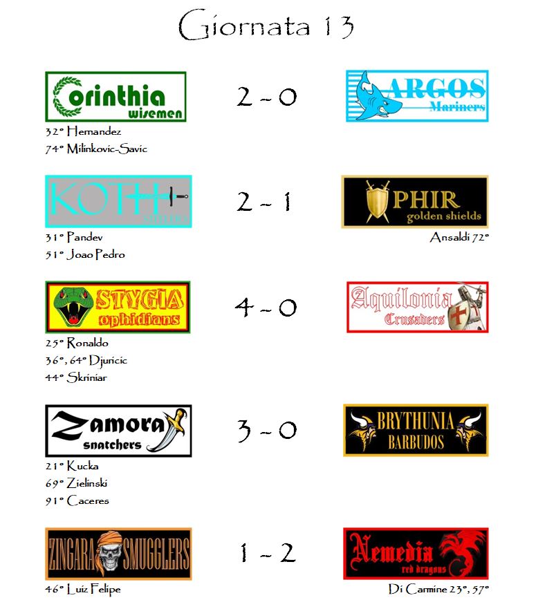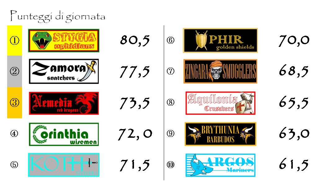 Quello della Stygia è stato, infatti, il miglior punteggio del weekend. Ronaldo e compagni hanno realizzato 80,5 punti lasciando dietro di sé una sorprendente Zamora e strapazzando i campioni in carica di Aquilonia con un nettissimo 4-0.