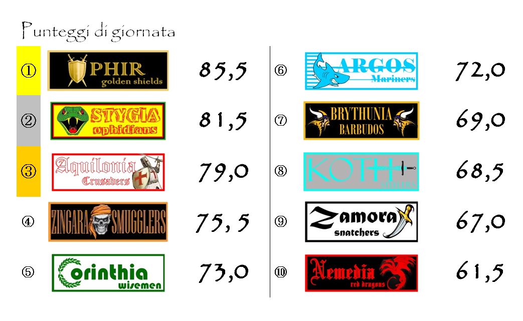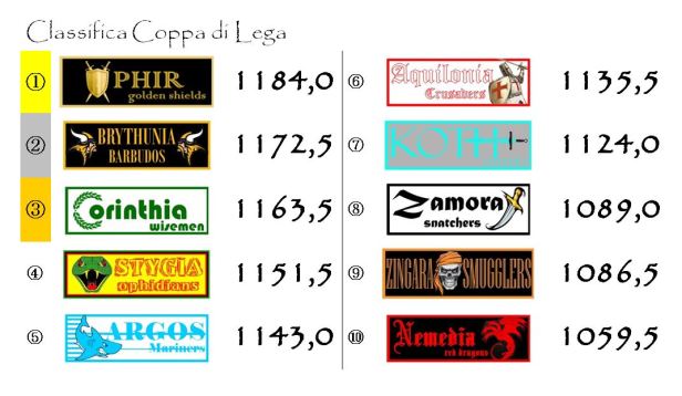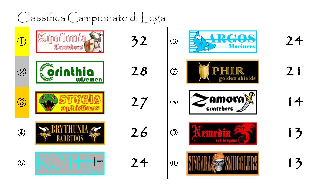 Stygia e Aquilonia stanno continuando il loro graduale processo di avvicinamento alla zona podio. Gli Ophidians, in particolare, hanno strappato la quarta piazza ad Argos e ora sono a dodici punti da Corinthia. Ci sarà grande battaglia da qui alla fine.