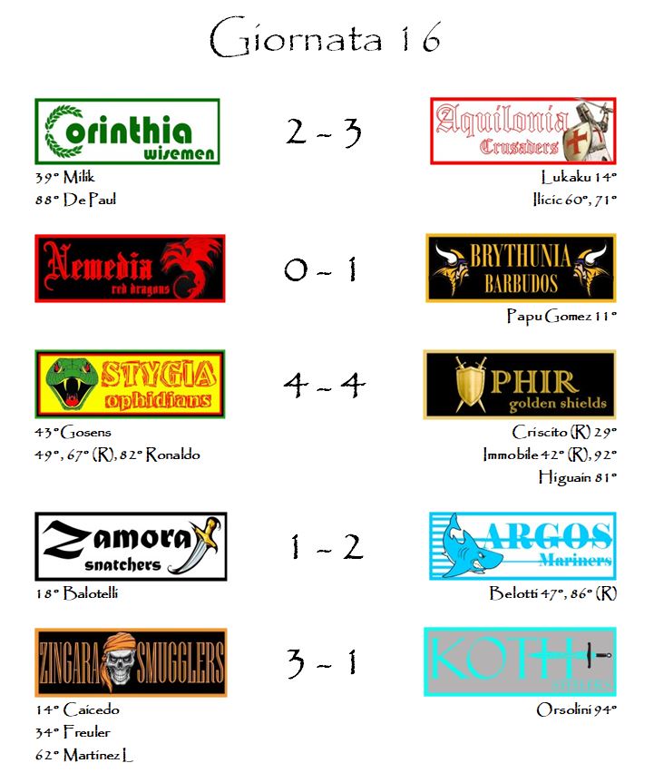 E per la sedicesima giornata è tutto. I risultati nel dettaglio potrete trovarli nel file mastro excell linkato sotto.