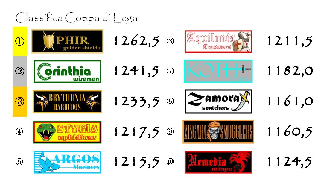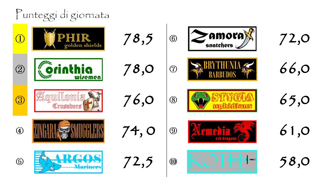 In zona podio il gruppo si sta compattando: Argos e Aquilonia si sono riavvicinate alla Stygia. Questo terzetto sarà sicuramente in grado di combattere sino alla fine almeno per l’Elmo di Bronzo.