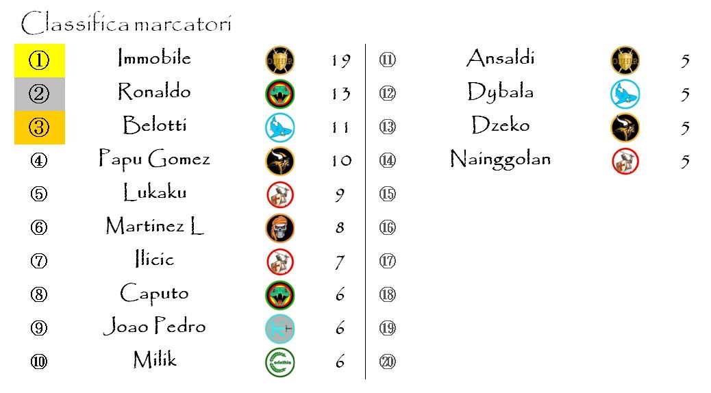Vi lascio al solito file excell con tutti i punteggi nel dettaglio e al video con tutti i goals della diciannovesima giornata di Serie A.