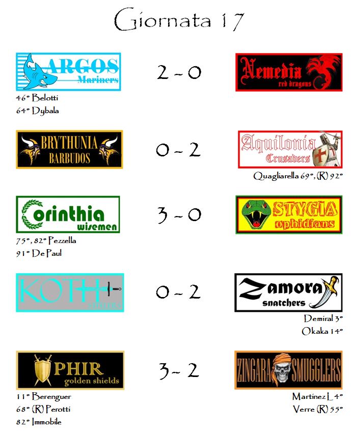 Gli Ophidians sono stati raggiunti al terzo posto dai Mariners. Quello di Argos sulla Nemedia è un successo che porta la firma di Samir Handanovic. Anche se sul tabellino sono finiti il Gallo Belotti e Paulo Dybala (ottima prestazione per entrambi in questo turno) il 2-0 è tutto merito del portierone sloveno e del rigore respinto a Muriel a San Siro nei minuti finali della gara contro l’Atalanta.