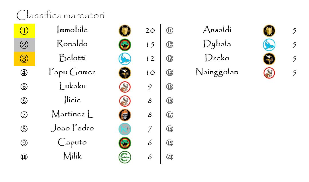 Vi lascio al solito file excell con i risultati in dettaglio e al video riassunto di tutti i goals del ventesimo turno di Serie A.