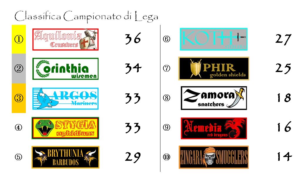 I campioni in carica di Aquilonia hanno ancora due punti di vantaggio su Corinthia ma sono nel mirino di Ophidians e Mariners, entrambe vincenti e lanciatissime nella rincorsa al primo posto.