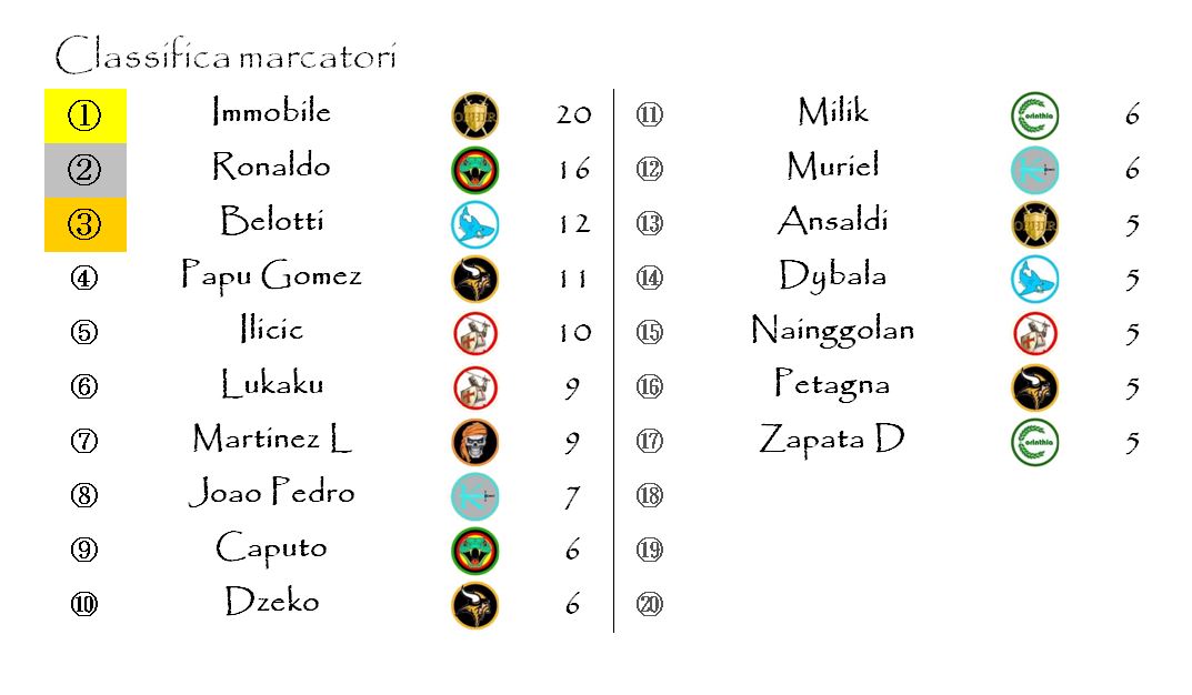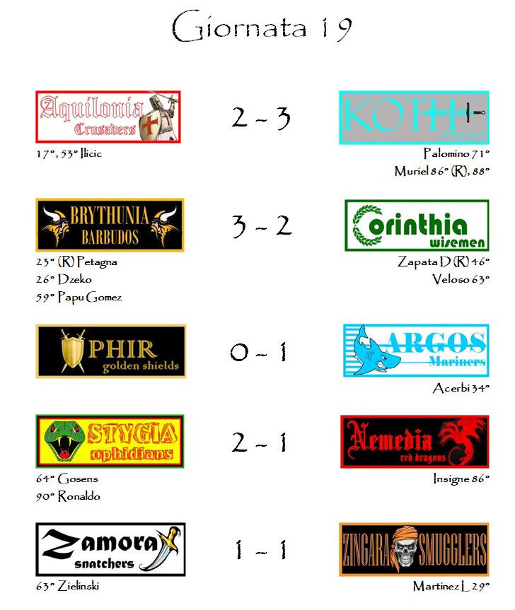 Altrettante, invece,le marcature extra: una per Veloso dei Corinthia Wisemen, un’altra per il Papu Gomez dei Brythunia Barbudos e una ancora per Palomino dei Koth Steelers.