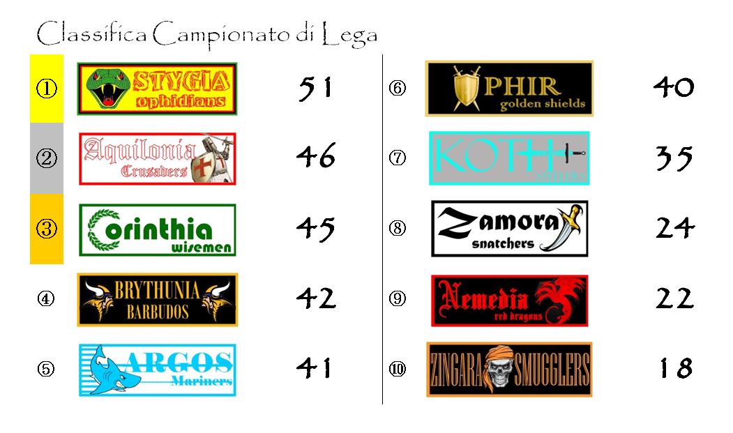 Argos ha scalzato Stygia dalla terza posizione compiendo un balzo in avanti di ben quattro punti. Aquilonia e Nemedia hanno scavalcato Corinthia e Zamora rispettivamente al sesto e all’ottavo posto.