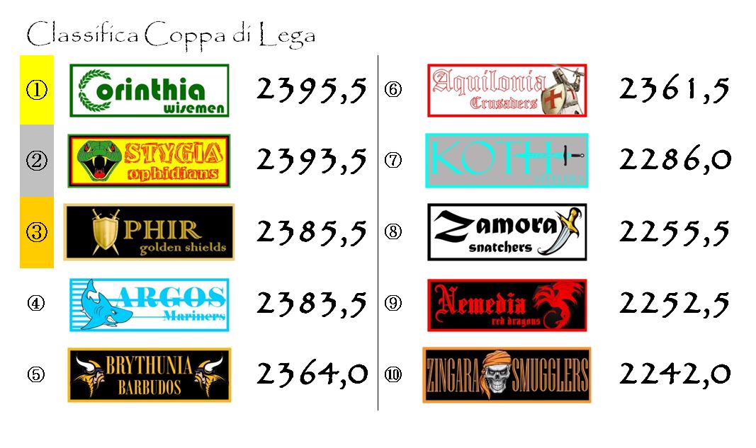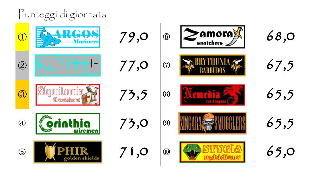 Brythunia e Aquilonia sembrano ormai tagliate fuori ma se riuscissero a piazzare qualche prestazione sopra gli ottanta in questi ultimi tre turni potrebbero anche rimettersi in gioco.