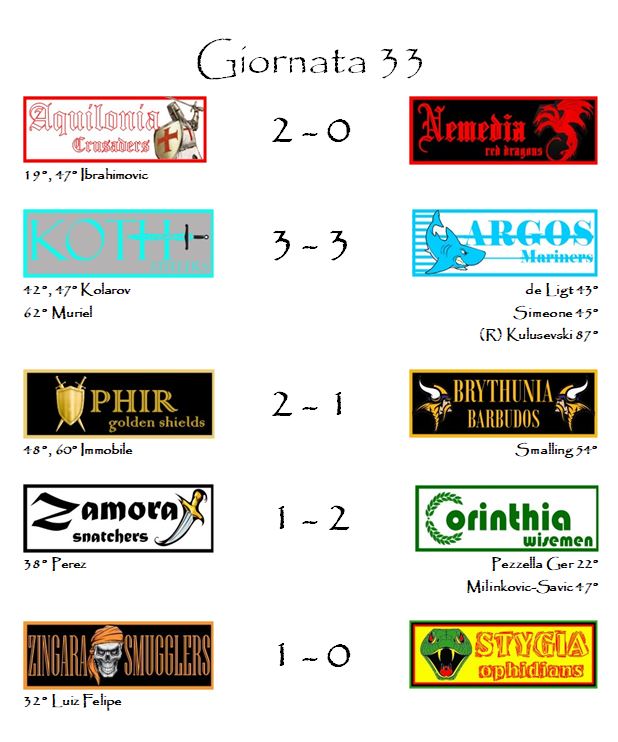 L’inattesa sconfitta della Stygia ha rimesso in gioco pure i campioni in carica di Aquilonia che hanno vinto l’ultimo derby della stagione contro Nemedia grazie alla doppietta di Zlatan Ibrahimovic. Per lo svedese, in odore di conferma dopo il rinnovo contrattuale a Pioli, è la prima volta su un tabellino dei marcatori del nostro fantacalcio.