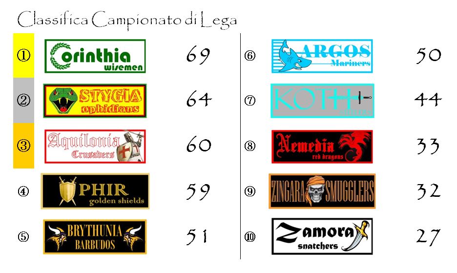 Aquilonia, che ha così mantenuto il terzo posto, dovrà difenderlo tra due giorni al Conan Memorial dall’assalto degli Ophir Golden Shields di Ciro Immobile che hanno superato per 2-0 gli Zingara Smugglers mantenendo inalterato il distacco dalla zona podio.