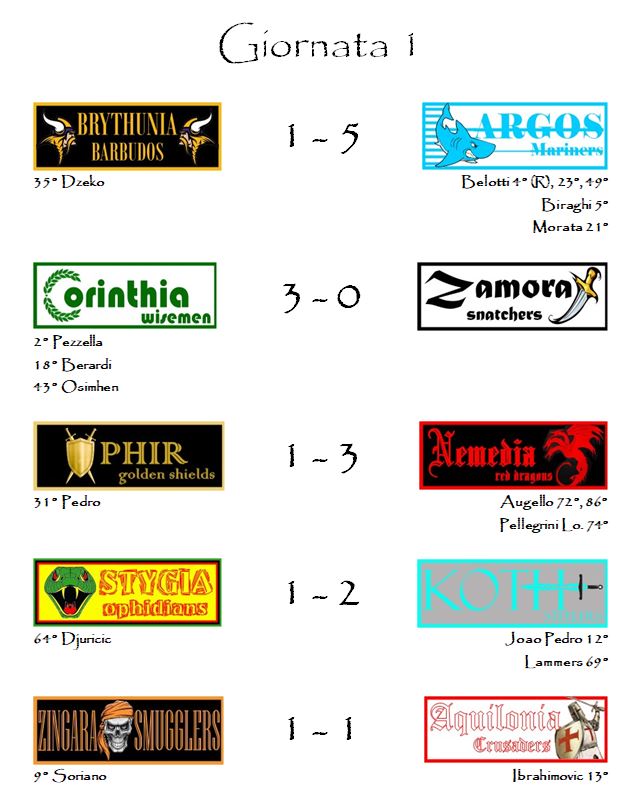 Nella seconda, complice l’impiego del cholito Simeone nel tridente (doppietta anche per lui e sempre in Torino-Cagliari), ne hanno rifilati ben 14 alle agguerrite Aquilonia e Nemedia (fantastico e sorprendente anche l’avvio di stagione dei Red Dragons).