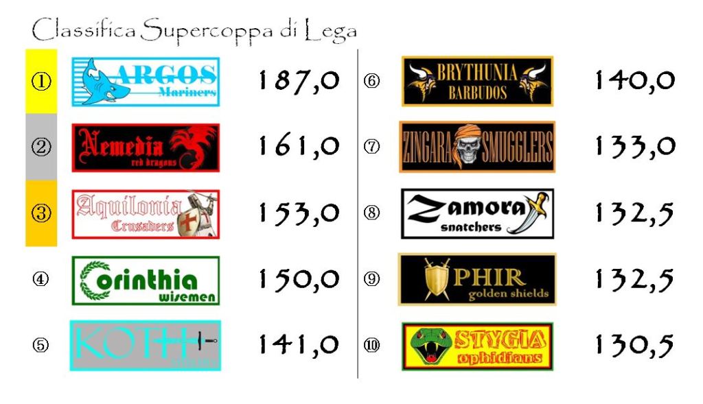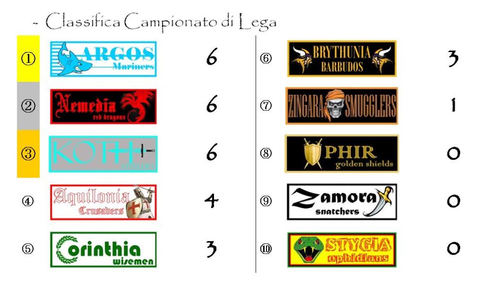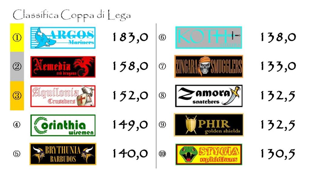 Anche la classifica di Coppa è, naturalmente, dominata da Argos, che conduce la corsa all’Elmo d’Oro con venticinque punti di vantaggio sulla sorprendente Nemedia.